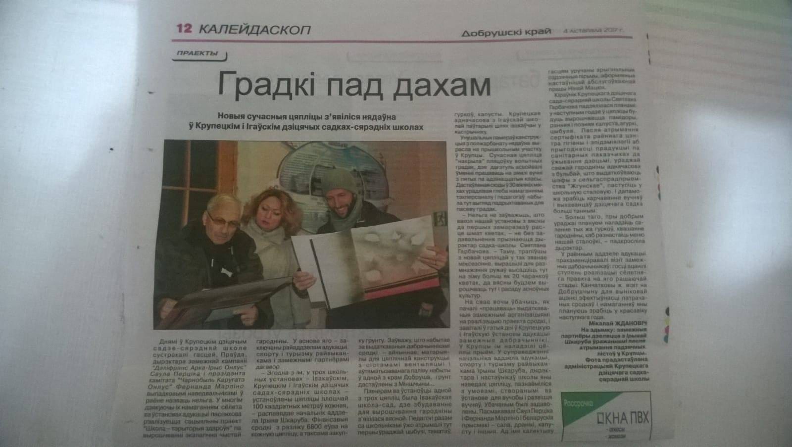 Il Giornale della città di Dobrush, per l’occasione, ha pubblicato un grande articolo per ringraziare la nostra Associazione e Delifrance. Ora, quasi 500 bambini, alla mensa scolastica, potranno nutrirsi di tanti prodotti sani e le famiglie non dovranno più pagare la mensa. Un progetto vincente che educa anche al lavoro, perché sono gli stessi ragazzi che coltiveranno frutta e verdura “sana”, non in terra contaminata.